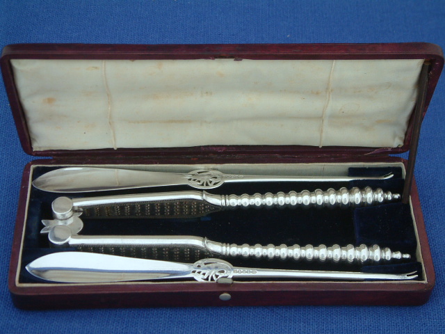 Cased dessert servers - a tour de force of electroplating, circa 1890. 9in.(23cm) L