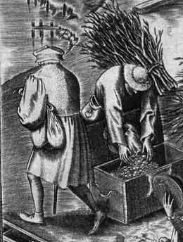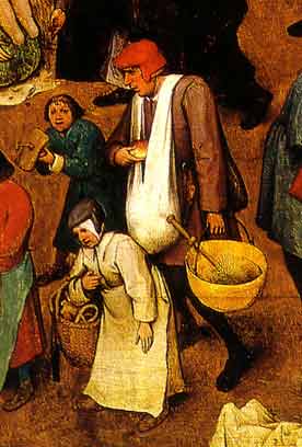 | I have made this as an unlined linen sack with slightly rounded ends. By folding it differently and wearing it over the shoulders, you achieve the useful vendor's sack as shown in Breughel's Battle between Carnival and Lent (1559) |