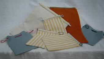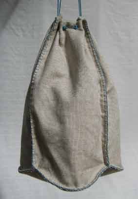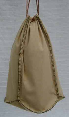 | Drawstring bags are available in a variety of shapes and sizes. The smaller ones are excellent as inexpensive waist pouches for children: Available, also a simple embroidered bag with handmade cord and leather shoulder pad, size 15 x 17 inches |