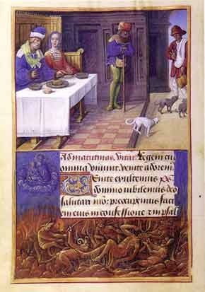 Hours of Henry VIII shows Dives feasting and denying Lazarus