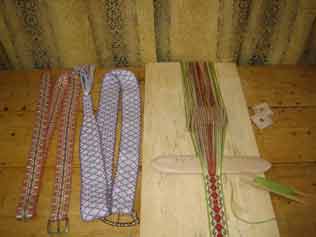 | This more detailed picture shows a tablet weaving in progress. The square tablets have a hole in each corner through which the thread passes. Turning the tablets creates the shed of the weave. This complex pattern is created by turning some of the tablets towards the weaver and some away. It is also determined by the threads passing through the tablets either right to left or left to right to maintain the symmetry of the design. Tablet weaving is very satisfying to do as the designs can be as simple or as complex as the weaver wishes. |