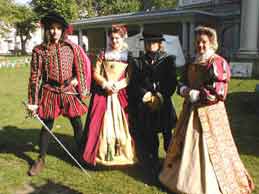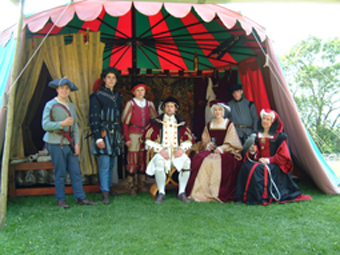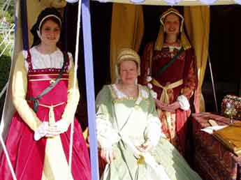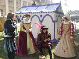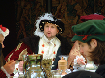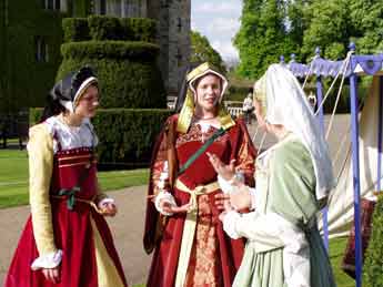 | With Henry VIII and Anne Boleyn at Eltham Palace. Notice the servant holding racquets for a game of battledore, forerunner of badminton. Henry was also a keen player of the new game of tennis, a complex game played in a special indoor court. |