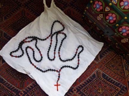 Lady Anne's Rosary laid out on her fine, linen wimple as she prepares to go to bed. It has beads of jet for the Aves and pairs of carnelian for the Paternosters. |