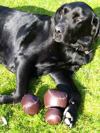 | These leather balls come in three sizes. They are hand-stitched with edge-to-edge seams and stuffed with wool - loom ends from our friend, Roger Poulson's mill, "Curlew Weavers", unspun wool or chopped woolen cloth. They even bounce! To give you an idea of the size, Benet agreed to model with them - he's a large labrador. The smallest is smaller than a tennis ball and the largest more than a handful.The large size is excellent for group games involving throwing and catching. These remain available but please allow time for cutting, stirching and stuffing. |