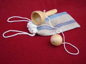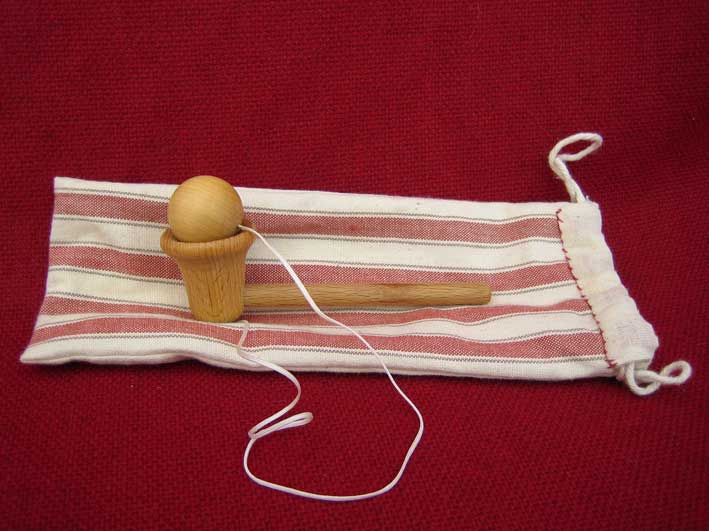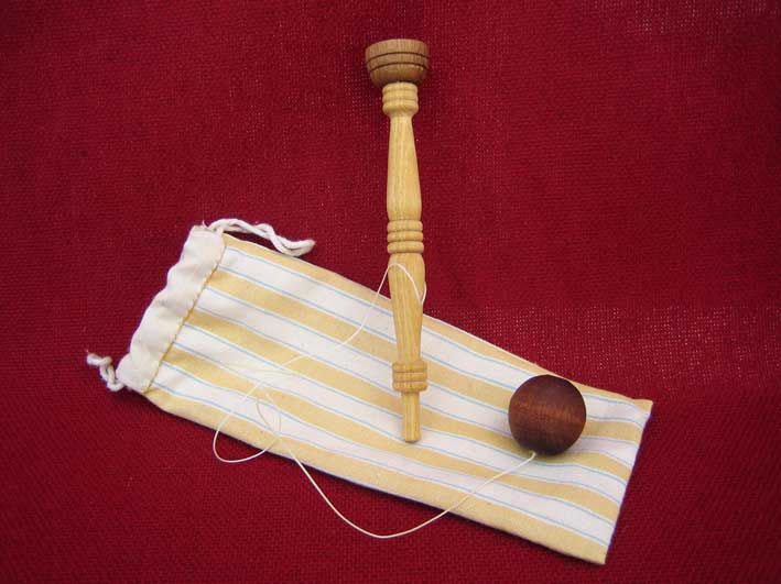 | The cup and ball may have come from Italy, though a similar game was known in ancient Greece. We know it became popular in the Tudor period and that it was enjoyed by the upper classes who had beautifully turned toys which were very expensive to buy. It was very popular in 18th century France and men and women are dpeicted playing it. Captain Cook found it being played in the Sandwich Islands in the 18th century. It was known in Mexico and among the American Indians. The version in which the ball can also be caught on a spike - that known as "Bilboquet" demands considerbale skill for the feat to be performed. |