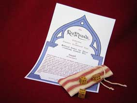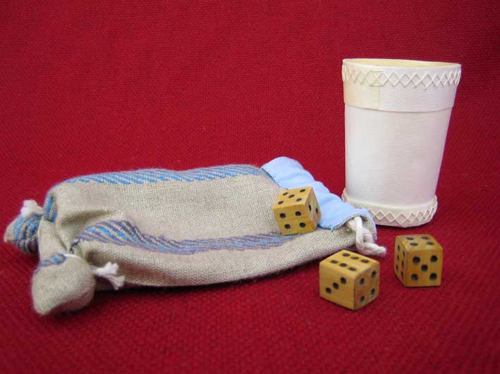 | Games of dice are suitable for all periods and have probably been consistently favoured for games of chance and gambling throughout the ages. Early clay dice from c 1500 BC were found at Mehenjodaro. The true knucklebone has been used as a die, owing to its almost regular rectangular shape. These probably gave rise to the long four-sided die. Any reasonable hard material which can be shaped has been used to make dice. The cube-shaped dice ones we make are of hard-wood, randomly numbered as was usually the case in the middle ages and supplied in a set of three with some suggested games, including the ever popular game of "Hazard". |