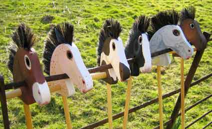 | Hobby horses have been around since at least 400 BC. Socrates's children played with one and they have enjoyed periods of popularity throughout the ages and all over the world. The simplest hobby horse of all is a stave of wood but horses's heads with reins or a cross bar are shown in many Medieval manuscripts. The use of wheels again seems to be a matter of choice. Each one of our hand-painted hobby horses is unique - you won't find another like it in the stable! |