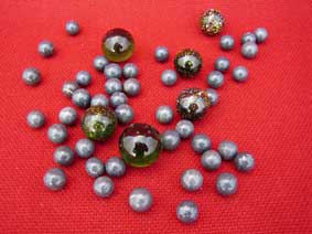 | Marbles have been used in play from prehistoric times to the present day. They have been found in a fourth millenium BC child's grave at Nagada, Egypt; marbles of jasper and agate were made at Chanhudaro in 2500 BC. Round clay pellets have been found in England dating from 312 BC. Early marbles were of clay, or stone; oak galls or nuts could also be used. We have some stone marbles appropriate to all periods. Glass marbles were introduced in the early 19th century. 25p each. There are just a few left and, to date, we have been unable to find any more stone marbles. |